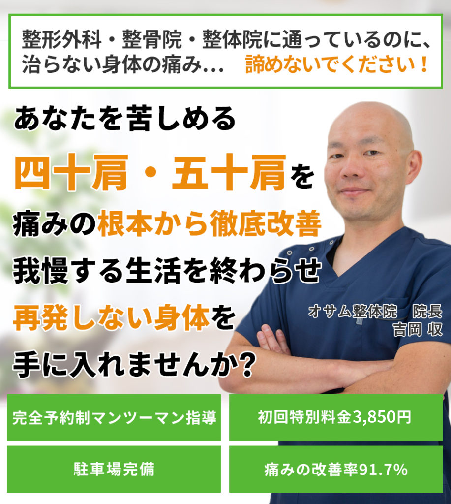 もしあなたが今、上記のようにお悩みなら、もしあなたが今、ほんの少しでも心のどこかで良くなりたい!と思われているならオサム整体院で、そのつらい痛みを改善していきませんか?